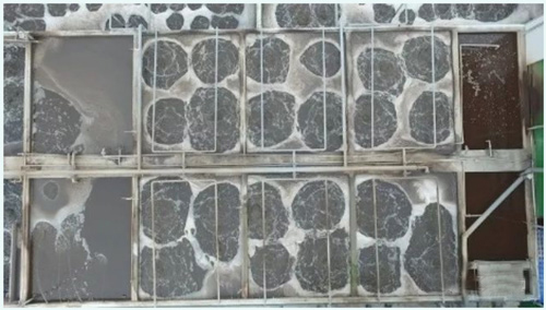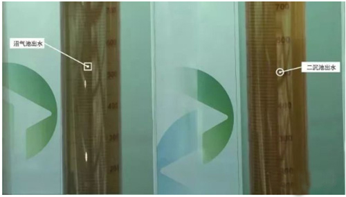 污水处理流程 具体流程: 01、养殖场排出的废水在收集池沉淀后,经由污水提升泵送达至固液分离机,进行干湿分离,得到滤液; 02、滤液通过压力泵抽送到厌氧反应器进行厌氧发酵,利用产生的沼气进行发电获得再生能源。 03、通过厌氧发酵的沼气池出水便经由氨氧化池,缺氧池到达好氧池。在处理过程中,技术部门改进工艺,将连续曝气改为间歇曝气,曝气时间减少三分之一,在节约时间的同时也节约成本。 04、二沉池出水后便要经过二级膜分离浓缩。通过后端增加的MBR膜反渗透膜来实现,MBR膜具有高效的截留率,能够将原水中的大部分物质截留,进而实现对废水的净化→分离→提纯。此外MBR将传统污水处理的曝气池,与沉淀池合二为一,大幅度的减少了占地面积。污水经过二级膜分离浓缩处理之后,基本上已经很清澈了。 沼气池与二沉池水颜色对比