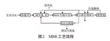 MBR主体工艺 工艺原理 膜生物反应器(Membrane Biore-actor,简称MBR)技术是膜分离技术和活性污泥法相结合的工艺。与活性污泥法有所不同,其不需要利用沉淀池实现固液分离,而是借助中空纤维膜替代沉淀池,因此其固液分离能力更加突出。 MBR工艺特点 MBR处理工艺能适应各种水质,并且具有良好的冲击负荷能力。处理池中采用新型弹性立体填料,比表面积较大,更容易实现微生物挂膜及脱膜,在相同的有机物负荷条件下,其去除有机物的效果更加明显,能提高空气中的氧在水中的溶解度;其工艺简单,不需要设置过滤池、沉淀池,可有效节约土地资源;同时,可有效减少水力的停留时间,减少污泥排放量,进而降低污泥处理成本。 MBR工艺流程 如图 2 所示,污水经格栅井流入调节池后经提升泵进入生物反应池,借助PLC控制器开启鼓风机进行充氧作业,生物反应池出水经循环泵进入膜分离处理环节,污水返回调节池。反冲洗泵借助清水池中的处理水达到反冲洗膜处理设备的目的,同时反冲污水返回调节池。提升泵开启与闭合由反应池的水位进行控制。膜单元的过滤操作与反冲洗操作,能通过手动与自动两种控制方式实现。