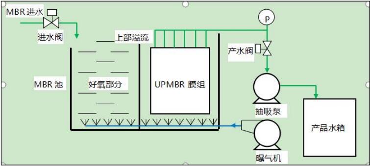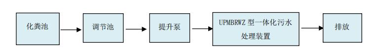 污水由化粪池提升至一体化设备,一体化设备包括A 区、O区、MBR反应区、清水区和设备间,原水首先进入A区,在兼氧状态下进行脱氮,反硝化菌利用污水中的有机物作为碳源,将膜池回流污泥中带入的大量NO3和NO2还原为N2并释放到空气中,BOD浓度继续下降,NO3浓度也大幅度下降。其次,在好氧区内在曝气状态下大量繁殖的活性污泥中微生物以及硝化菌群、磷细菌可以降解或吸附水中含碳、氨氮、磷有机污染物质,再进入MBR膜反应器中以达到净化水质的目的。 膜生物反应器(简称MBR工艺)是利用膜取代二沉池对生化工艺的泥水混合物进行固液分离,它使用开放式中空纤维膜元件,将膜直接置于好氧池中,通过泵的负压抽吸,利用大气压力,使水透过膜表面,从中空纤维膜内侧抽出,达到过滤净化的目的。 MBR污水处理的运行流程见下图: