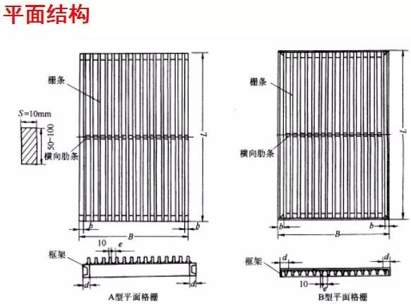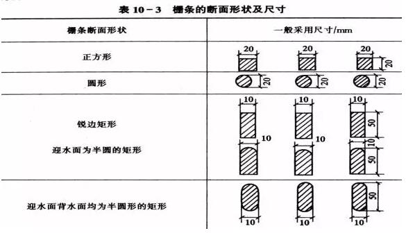 格栅栅条的断面形状有圆形、矩形及方形,圆形的水力条件较方形好,但刚度较差。自前多采用断面形式为矩形的栅条。