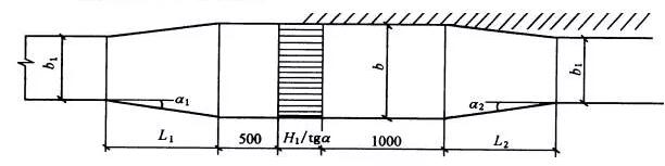 架设格栅的渠道,栅前和栅后应分别保持0.5m和1.0m以上的直线距离.为了防止栅前渠道内水面出现阻流回水现象,架设格栅的渠段宽度由原来的b1放宽到b,渠前有扩大段L],展开角20度,渠后有收缩段L,,一般取L,=L/2。 |