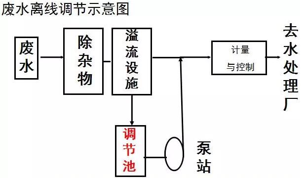 离线调节则是只有超过处理设计流量的那一部分流量才进人调节池,对废水组分和流量的变化仅起轻 微的缓冲作用,但节省能源。