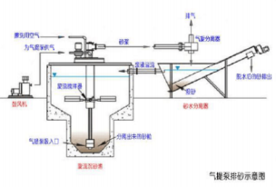 旋流沉砂池结构简介 (6)自吸砂泵排砂示意图 自吸砂泵, 是叶轮砂泵, 装置在旋流沉砂池的顶部,间歇地将砂从池底部抽出来,将砂浆提升至砂水分离器。